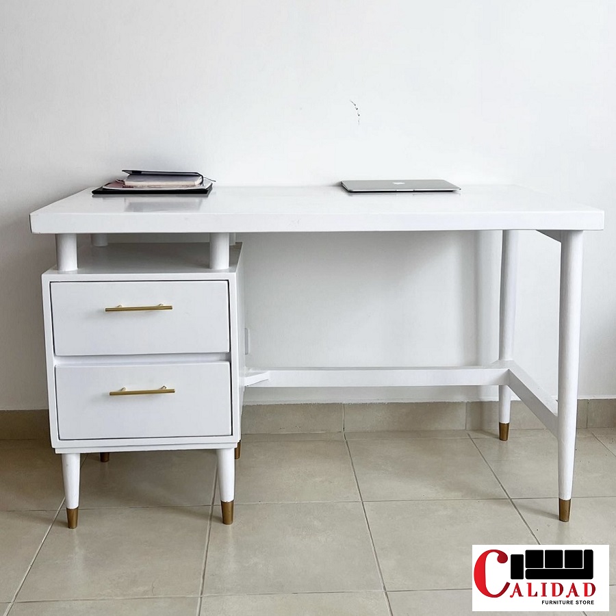 Introducing the Alessio Study Table in brilliant white—a striking blend of modern design and focused functionality. With sleek gold-accented drawers for your essentials and chic tapered legs capped in brass, organize your thoughts in style. Elevate your workspace with Alessio—a study table where minimalist form meets everyday function.